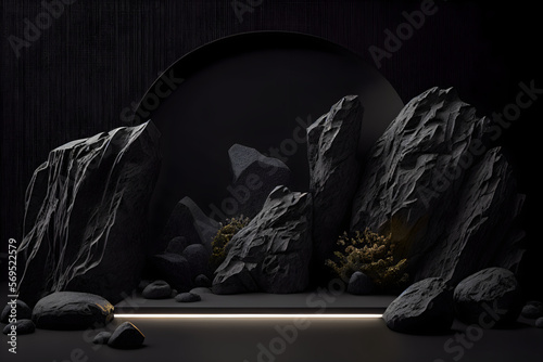 3D rendering of dark podium stone for display product showcase on the black abstract background scene, with light and shadow, luxury style, Generative Ai.