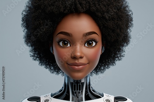 3D Robot Woman Character with Afro Hairstyle and Friendly Expression Displaying Polished Features and Metallic Elements in a Neutral Background