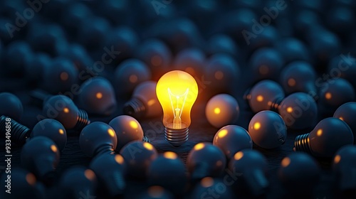 3D scene of a single vibrant light bulb glowing amidst a dark array of unlit bulbs, offering space for inspirational writing