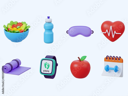 healthy, lifestyle, icon, three-dimensional, wellness, fitness, nourishment, symbol, exercise, diet, yoga, apple, water, nubes, sleep, step, mat, food, gym, activity, health, vitality, balance, well-being, energy, track, hydratation, fruit, cardio, routine, vegetable, mindfulness, relaxation, weight, training, progress, motivation, freshness, habit, healthful, journey, holistic, active, movement, rejuvenation, calm, peace, fit