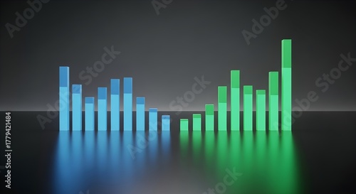 chart, graph, bar, datum, visualisation, analysis, business, finance, trend, growth, decayed, performance, statistic, reporting, comparison, sale, profit, revenue, market, strategy, investment, economy, indicator, tracking, abstract, three-dimensional, render, digital, modern, professional, minimal, blue, green, colours, glowing, dark, background, segmented, stacked, progress, result, improvement, quarterly, financial, infographic