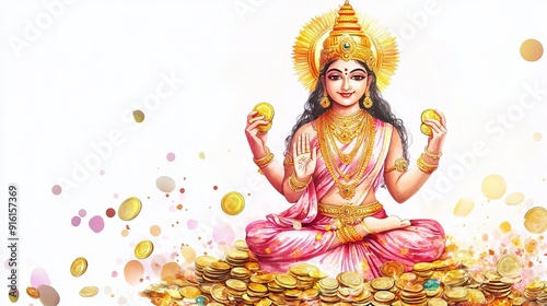 3D Watercolor Goddess Lakshmi with Gold Coins | Hindu Art