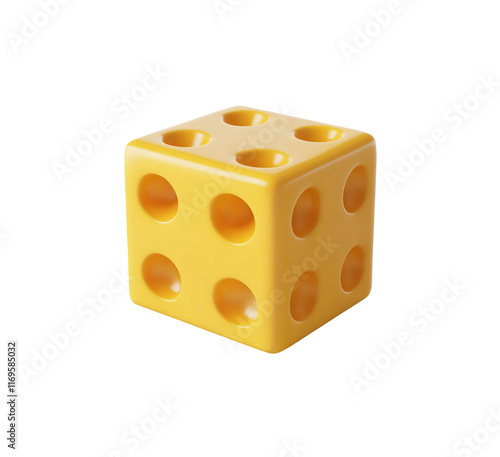 3D yellow cube-shaped cheese with large holes on all sides. The cheese has a smooth, glossy surface, showcasing a playful and cartoonish appearance. Isolated on transparent background, png.