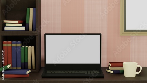 ノートパソコン 本 ホワイトスペース コーヒー ビジネス 書斎 3DCG