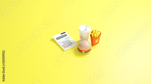 3DCG rendering photo-realistic illustration of a toy hamburger set and a calculator on a flat surface.
