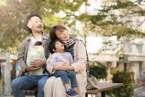family, family, walk, japanese, fall, winter, muffler, people, child rearing, yellow, baby, children, open air, smile, mother, man, seated, woman, mother, lifestyle, baby, 30s, happy, mother, park, chum, couple, father, father, mother, light, waist up, toddler, embrace, fun, bench, look up, future, hope