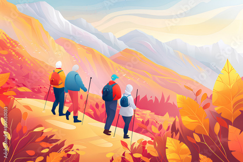climb, backpack, healing, trek, walking, vacation, backpacker, outdoors, hiker, fun, hike, fall, family, fellow, yellow, camping, mountaineering, picnic, family, outing, excursion, tour tourism, travel, pastel colour, illustration, background, people, couple, couple, friends