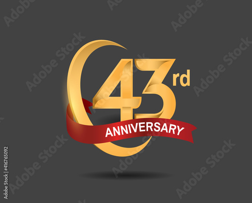 43 anniversary design logotype golden color with ring and red ribbon for celebration, greeting card, invitation and special event
