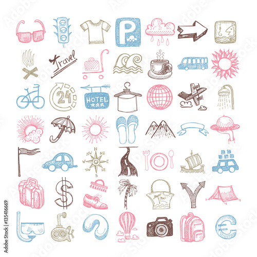 aeroplane, arrow, avatar, backpack, bag, balloon, bicycle, bus, camera, car, clothes, collection, compass, design, drawing, fire, fishing, flag, hand drawing, hotel, icon, baggage, money, mountain, palm, parking place, pictogram, eatery, road, sea, ship, shower, suitcase, sun, taxi, tent, traffic light, transport, travel, umbrella, vector, weather