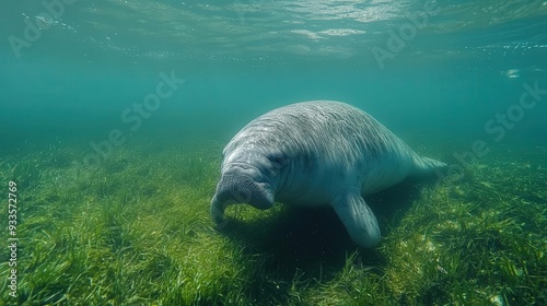 4K Realistic Gentle dugong grazing on seagrass meadow, clear waters,
