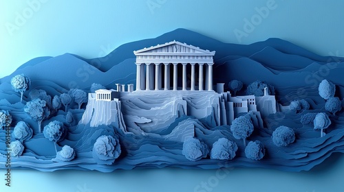 5. A detailed 3D paper cut depiction of the Acropolis in Athens, with the Parthenon standing tall on a rocky hill, all placed on a solid background