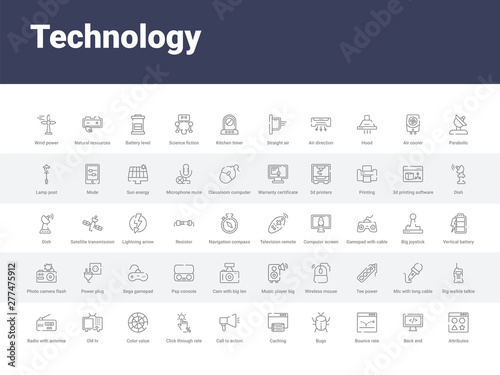 50 technology set icons such as attributes, back end, bounce rate, bugs, caching, call to action, click through rate, color value, old tv. simple modern vector icons can be use for web mobile