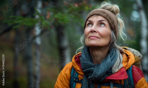 50 year old woman, going for a hike, beautiful wilderness, looking up and feeling inspired, photo realistic, high angle, 35mm lens, Hyper realistic photo. very detailed