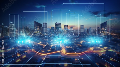 5G network digital hologram and internet of things on city background.Double exposure city of cpu 5g.5G network wireless systems,IoT(Internet of Things),communication network concept