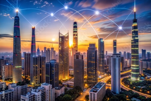5G smart cityscape at dusk with illuminated skyscrapers and network