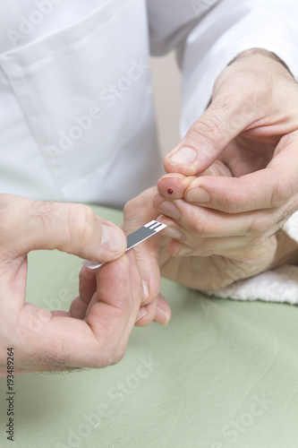 5. Kropelka krwi na palcu i dłonie lekarza z papierkiem do glukometru. Mierzenie cukru.