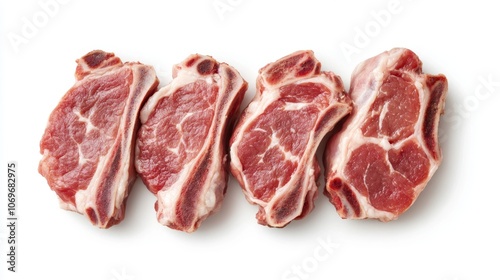 5.Top view of pork neck chops against a white background, marbled with natural fat, pink hues and fine textures, clean isolated presentation for package design, fresh and appealing