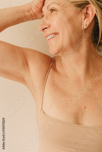 60s, adult, age, attitude, authentic, body part, bra, caucasian, confident, daylight, elderly, glad, happy, healthy, human, indoor, indoor, lady, lifestyle, mature adult, middle-aged, natural, neutral, portrait, positive, retired, skin, smile