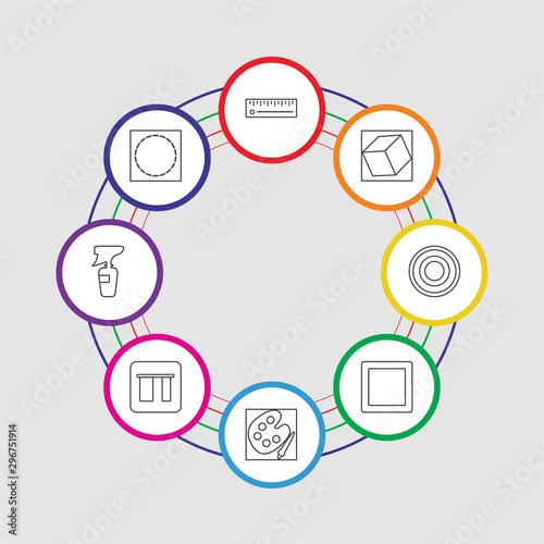 8 colorful stroke icons set included circle, spray, vertical alignment, paint palette, square, spiral, cube, ruler