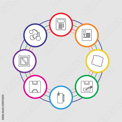 8 colorful stroke icons set included copy, edit, save, tag, save, , text, calculator