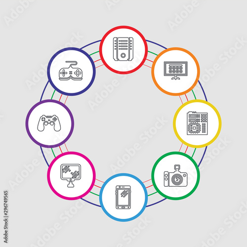 8 colorful stroke icons set included game controller, game controller, personal computer, smartphone, photo camera, motherboard, smart tv, servers