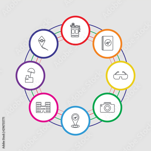 8 colorful stroke icons set included kite, food stand, sand castle, map, photo camera, sunglasses, passport, oxygen tank