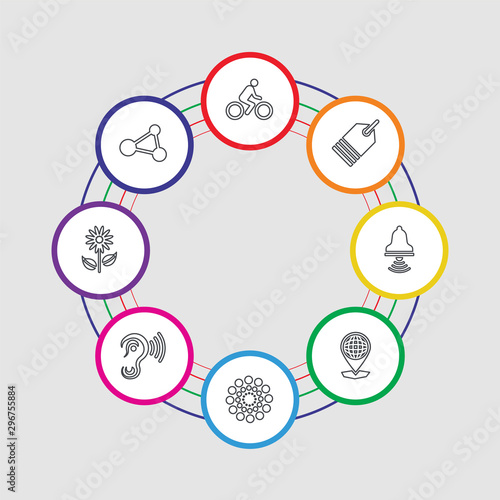 8 colorful stroke icons set included share, flower with leaves, ear with sound bar, big and small dots, big map placeholder, alarm bell, clothes label, man on motorbike