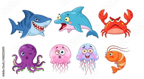 8 different funny expresion cartoon jellyfishes, octopus, shrimp, crab, shark, dolphin, isolated on white background