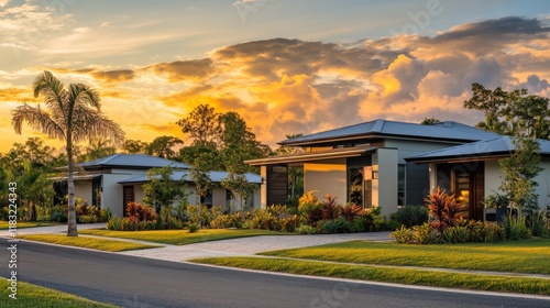 89.Twin modern houses with flat roofs, sleek designs, and lush front gardens, perfectly illuminated by a golden-hour sky with gentle clouds in the background.