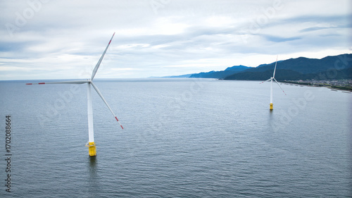 雨が降りそうな9月の富山県入善町沿岸からみる洋上風力発電風車をはじめとする様々なもの