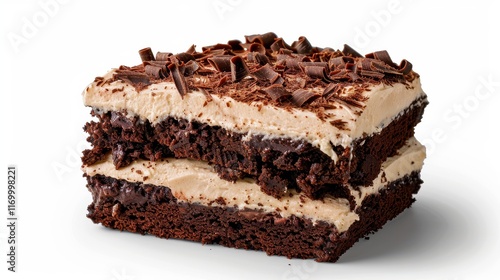 90. Triple layer chocolate cake with rich frosting and chocolate shavings, Isolated, White background, Editorial Photography, Studio lighting, Magazine foods style