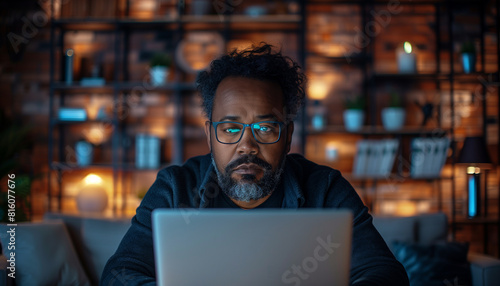 a shot capturing the programmer's face illuminated by the laptop screen, with a background of neatly arranged shelves and contemporary decor, programmer, IT specialist, c