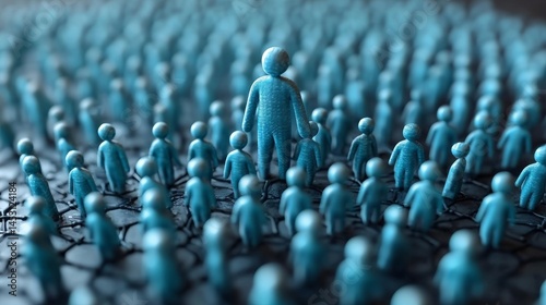 figure, group, central, pair, standing, out, many, similar, blue, tiny, small, crowd, unique, different, distinct, sharpened, perspective, depth, texture, surface, pattern, dark, light, tone, colours, shades, contrast, detail, image, digital, render, design, illustration, three-dimensional, modelling, composition, arrangement, miniature, people, together