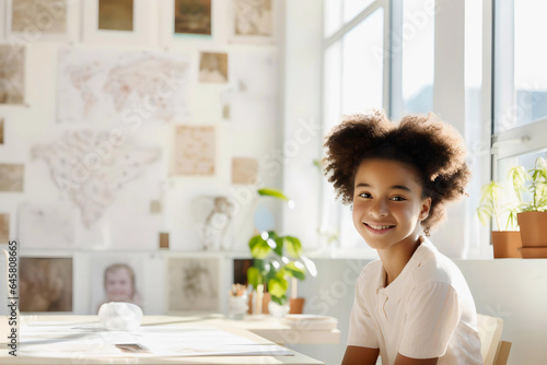 A 10-year-old afro-american girl sits at a desk in a white sunny classroom in a European learning center, on the white wall of which children's drawings hang