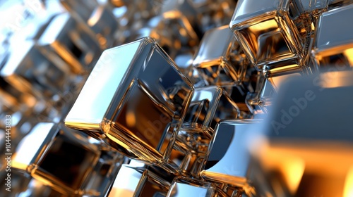 A 3D abstract background with metallic shapes and reflective surfaces, providing depth and a futuristic feel, ideal for tech and digital branding