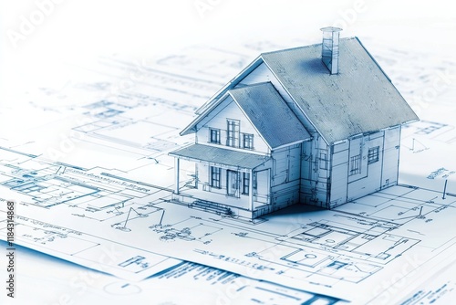 A 3D house model sits atop architectural blueprints, symbolizing construction, design, and home planning in a modern setting.