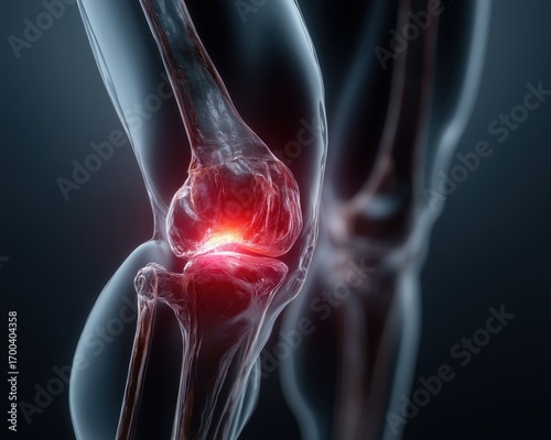 A 3D illustration of a human knee joint depicting pain with a glowing red focus, showcasing anatomy and health awareness.