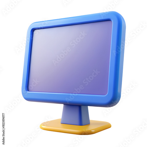 A 3d render of a vintage computer monitor with a blue frame and yellow base isolated on transparent background
