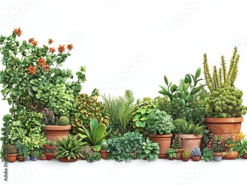 A 3D rendering concept showcasing plants, ornamental flowers, grass, and decorative blooms in a yard, with an alpha background. Transparent background