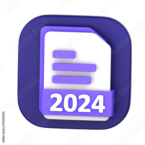 A 3D rendering of a purple document file icon, highlighting the year 2024.