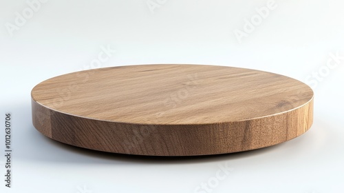 A 3D round podium with a wooden texture, softly lit and placed on a clean white background, providing a natural and warm aesthetic for eco-friendly product displays.