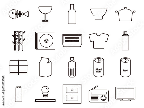 capital, recycling, collection, pot, illustration, icon, pictogram, mark, black-and-white, monochrome, seal, stacker, set, design, ceramic, paper, journal, aluminium, steel, plastic bottle, garbage, plastic, television, glasses, furniture, bulb, spray, outfit, canned, battery, battery