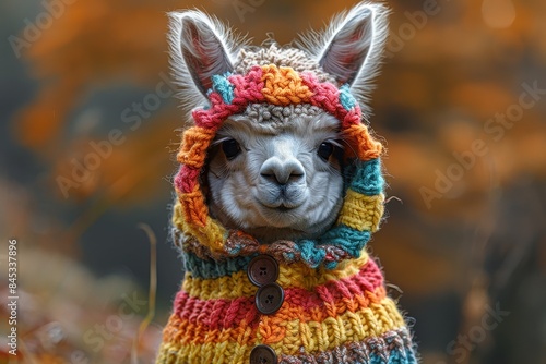 A baby alpaca wearing a colorful knitted sweater, standing in a hilly pasture. The alpaca has a gentle and calm expression