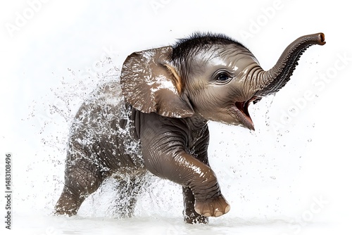 A baby elephant splashing in water with its trunk raised on a bright white background in studio