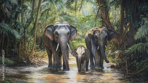 A baby elephant standing between two large adults in the shallow river, surrounded by dense tropical vegetation, in a peaceful Thai scene.