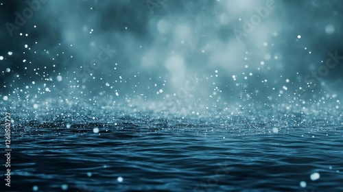 A background of small, white particles floating on dark blue water, creating an ethereal and dreamy atmosphere. The particles should have varying sizes to create depth in the scene.