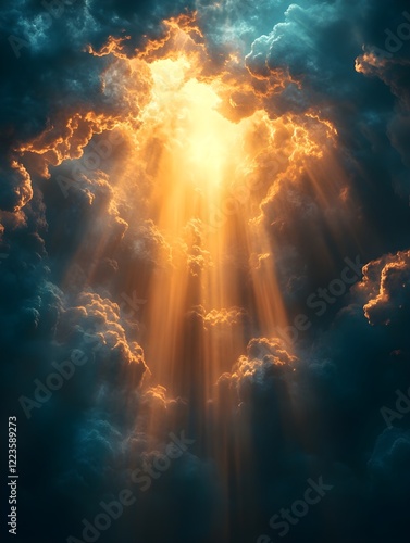 A background of sunlight peeking through storm clouds.