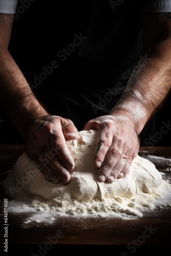 baker, dough, flour, wooden, table, hand, kneading, dusted, covered, ball, process, bakery, making, bread, preparation, food, pastry, cooking, kitchen, raw, black, ingredient, work, skill, closeup, background, rustic, traditional, homemade, fresh