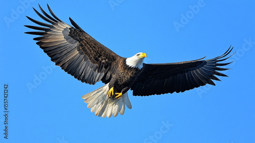 A bald eagle in full flight against a vivid blue sky, showcasing its impressive wingspan and natural beauty.