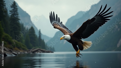 A bald eagle in the wild, with mountains and rivers in the background, emphasizing its natural majesty.